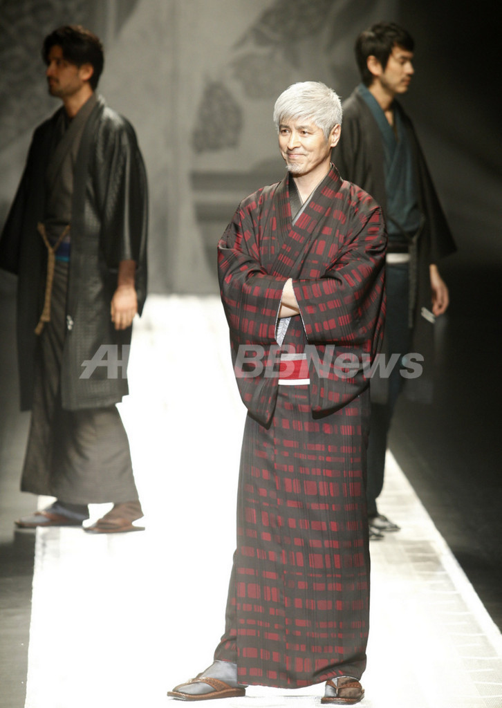 従来の“キモノ”のイメージを打ち砕くかのようなデザインが特徴のジョウタロウ サイトウの今シーズンは、「ドレスピープル」をテーマに掲げた。フォーマルなシーンにも、カジュアルなシーンにも対応できる着物は、素材もストレッチ素材やデニム素材など幅広い。色の組み合わせや、柄の組み合わせにおいても、斎藤上太郎の手にかかれば、瞬く間にモダンでおしゃれなスタイルに変身する。民族衣装としての着物ではなく、ドレスを着るような感覚でさまざまなスタイルを提案した。【岩田奈那】(c)AFPBB News