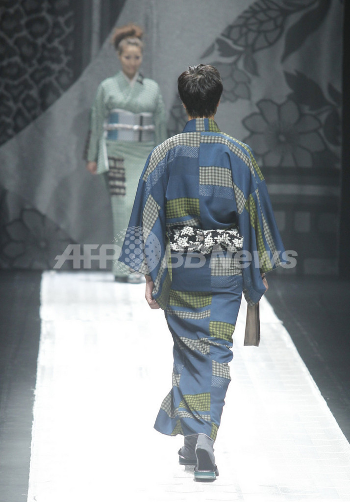 従来の“キモノ”のイメージを打ち砕くかのようなデザインが特徴のジョウタロウ サイトウの今シーズンは、「ドレスピープル」をテーマに掲げた。フォーマルなシーンにも、カジュアルなシーンにも対応できる着物は、素材もストレッチ素材やデニム素材など幅広い。色の組み合わせや、柄の組み合わせにおいても、斎藤上太郎の手にかかれば、瞬く間にモダンでおしゃれなスタイルに変身する。民族衣装としての着物ではなく、ドレスを着るような感覚でさまざまなスタイルを提案した。【岩田奈那】(c)AFPBB News
