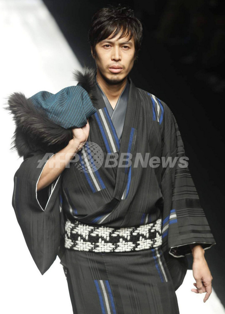 従来の“キモノ”のイメージを打ち砕くかのようなデザインが特徴のジョウタロウ サイトウの今シーズンは、「ドレスピープル」をテーマに掲げた。フォーマルなシーンにも、カジュアルなシーンにも対応できる着物は、素材もストレッチ素材やデニム素材など幅広い。色の組み合わせや、柄の組み合わせにおいても、斎藤上太郎の手にかかれば、瞬く間にモダンでおしゃれなスタイルに変身する。民族衣装としての着物ではなく、ドレスを着るような感覚でさまざまなスタイルを提案した。【岩田奈那】(c)AFPBB News