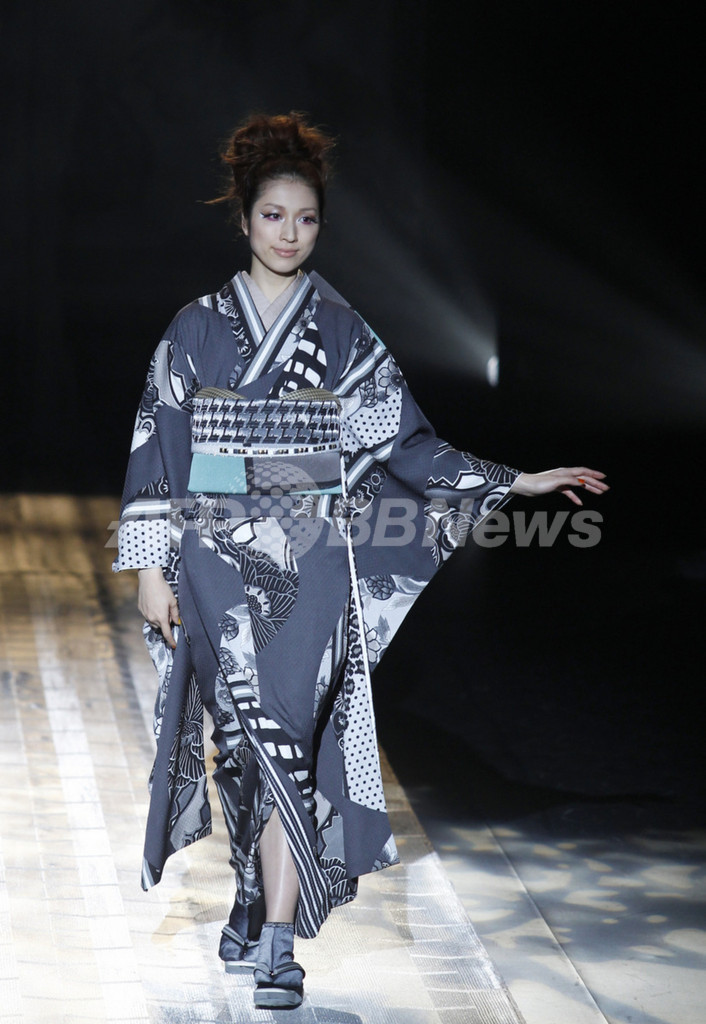 従来の“キモノ”のイメージを打ち砕くかのようなデザインが特徴のジョウタロウ サイトウの今シーズンは、「ドレスピープル」をテーマに掲げた。フォーマルなシーンにも、カジュアルなシーンにも対応できる着物は、素材もストレッチ素材やデニム素材など幅広い。色の組み合わせや、柄の組み合わせにおいても、斎藤上太郎の手にかかれば、瞬く間にモダンでおしゃれなスタイルに変身する。民族衣装としての着物ではなく、ドレスを着るような感覚でさまざまなスタイルを提案した。【岩田奈那】(c)AFPBB News