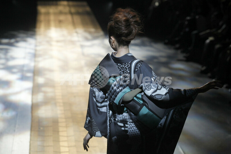 従来の“キモノ”のイメージを打ち砕くかのようなデザインが特徴のジョウタロウ サイトウの今シーズンは、「ドレスピープル」をテーマに掲げた。フォーマルなシーンにも、カジュアルなシーンにも対応できる着物は、素材もストレッチ素材やデニム素材など幅広い。色の組み合わせや、柄の組み合わせにおいても、斎藤上太郎の手にかかれば、瞬く間にモダンでおしゃれなスタイルに変身する。民族衣装としての着物ではなく、ドレスを着るような感覚でさまざまなスタイルを提案した。【岩田奈那】(c)AFPBB News