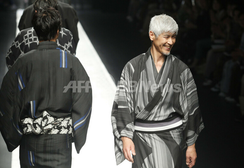 従来の“キモノ”のイメージを打ち砕くかのようなデザインが特徴のジョウタロウ サイトウの今シーズンは、「ドレスピープル」をテーマに掲げた。フォーマルなシーンにも、カジュアルなシーンにも対応できる着物は、素材もストレッチ素材やデニム素材など幅広い。色の組み合わせや、柄の組み合わせにおいても、斎藤上太郎の手にかかれば、瞬く間にモダンでおしゃれなスタイルに変身する。民族衣装としての着物ではなく、ドレスを着るような感覚でさまざまなスタイルを提案した。【岩田奈那】(c)AFPBB News