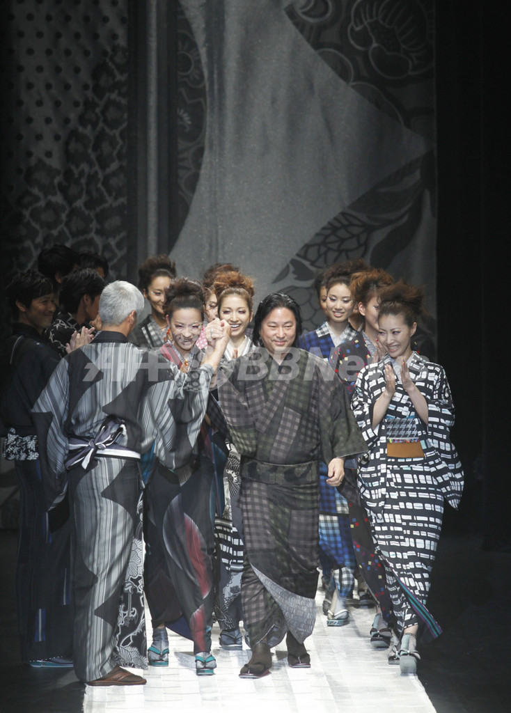 従来の“キモノ”のイメージを打ち砕くかのようなデザインが特徴のジョウタロウ サイトウの今シーズンは、「ドレスピープル」をテーマに掲げた。フォーマルなシーンにも、カジュアルなシーンにも対応できる着物は、素材もストレッチ素材やデニム素材など幅広い。色の組み合わせや、柄の組み合わせにおいても、斎藤上太郎の手にかかれば、瞬く間にモダンでおしゃれなスタイルに変身する。民族衣装としての着物ではなく、ドレスを着るような感覚でさまざまなスタイルを提案した。【岩田奈那】(c)AFPBB News