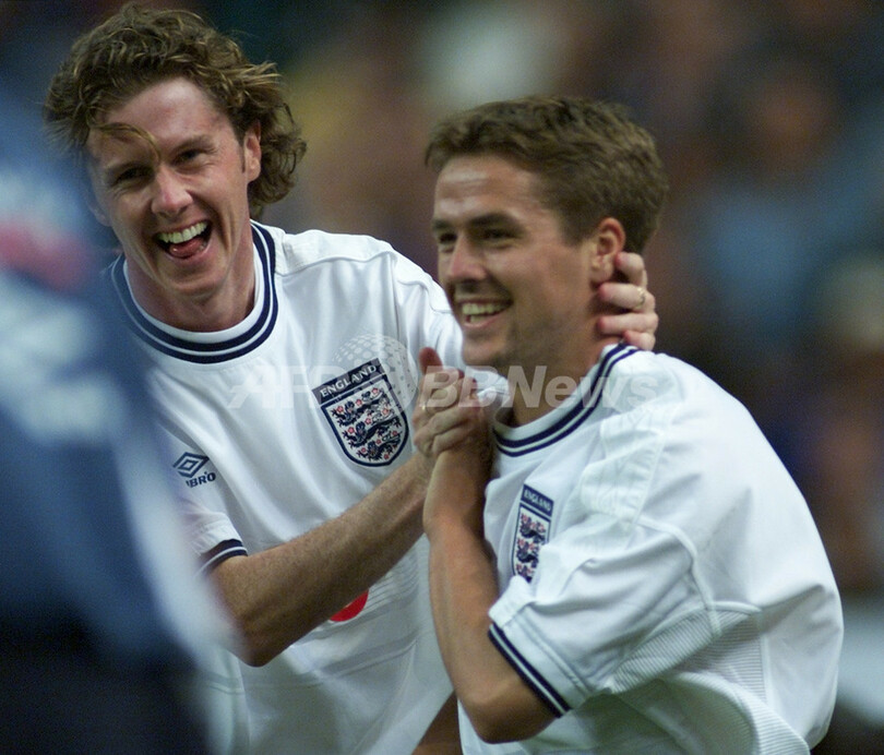 フランスとの国際親善試合で得点を挙げ、チームメイトのスティーブ・マクマナマン(Steve McManaman、左)に祝福されるマイケル・オーウェン(2000年9月2日撮影)。(c)AFP/OLIVIER MORIN