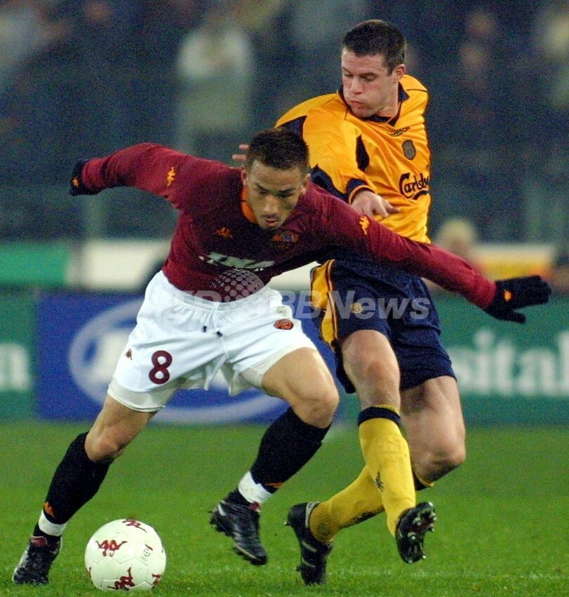 UEFAカップ(UEFA Cup)でASローマ(AS Roma)の中田英寿(Hidetoshi Nakata、左)とボールを競るリバプール(Liverpool FC)のマイケル・オーウェン(2001年2月15日撮影)。(c)AFP/GABRIEL BOUYS