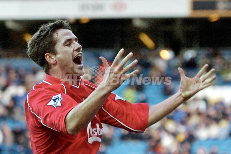 イングランド・プレミアリーグ、リーズ・ユナイテッド(Leeds United)戦で得点を挙げ歓喜するリバプール(Liverpool FC)のマイケル・オーウェン(2002年2月3日撮影)。(c)AFP/PAUL BARKER