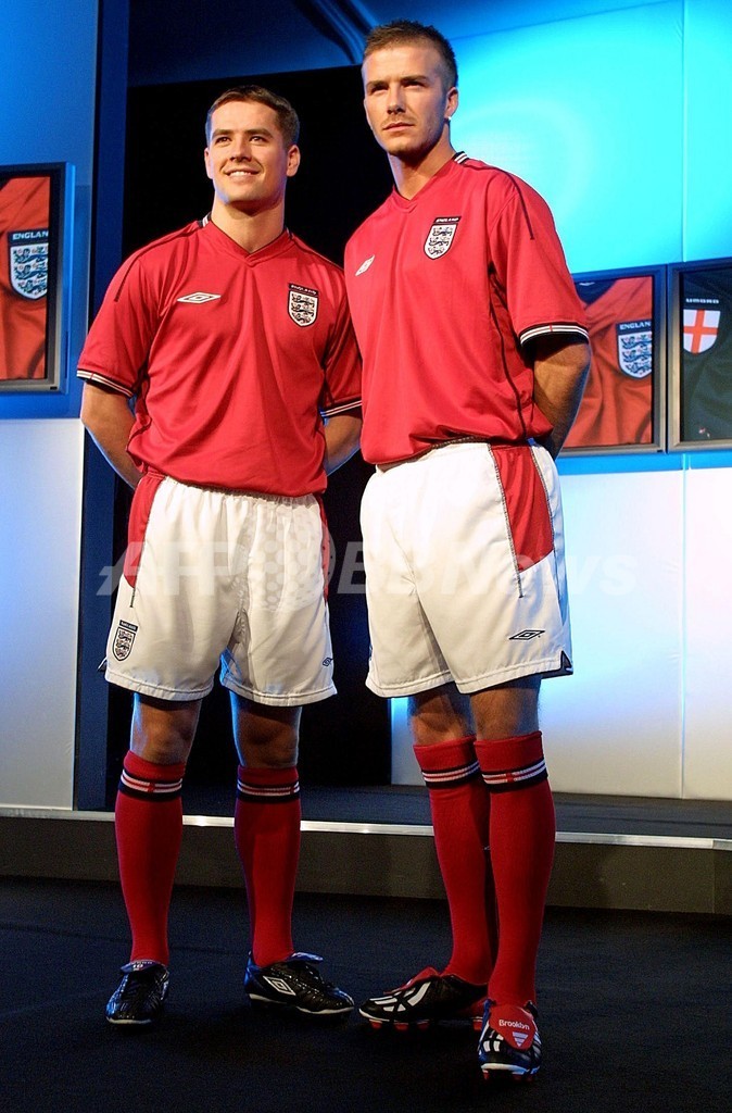 イングランド代表のユニフォーム発表会でデビッド・ベッカム(David Beckham、右)とともにポーズをとるマイケル・オーウェン(2002年2月11日撮影)。(c)AFP/Odd ANDERSEN