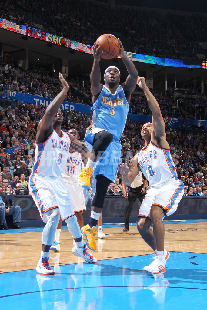 オクラホマシティ・サンダーの守備陣を突破してレイアップシュートを狙うデンバー・ナゲッツのタイ・ローソン(Ty Lawson、中央、2013年3月19日撮影)。(c)AFP/Getty Images/NBAE/Layne Murdoch Jr.
