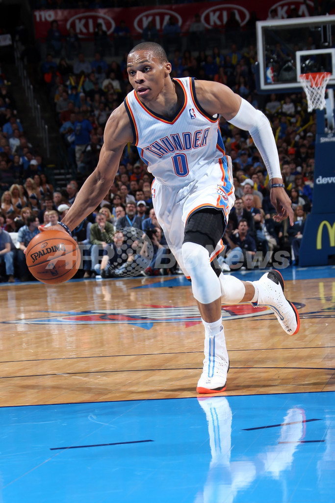 ドリブルでボールを運ぶオクラホマシティ・サンダーのラッセル・ウエストブルック(Russell Westbrook、2013年3月19日撮影)。(c)AFP/Getty Images/NBAE/Layne Murdoch Jr.
