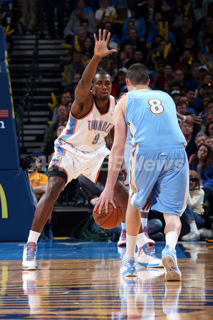 オクラホマシティ・サンダーのセルジ・イバカ(Serge Ibaka、奥)とマッチアップするデンバー・ナゲッツのダニロ・ガリナーリ(Danilo Gallinari、2013年3月19日撮影)。(c)AFP/Getty Images/NBAE/Layne Murdoch Jr.