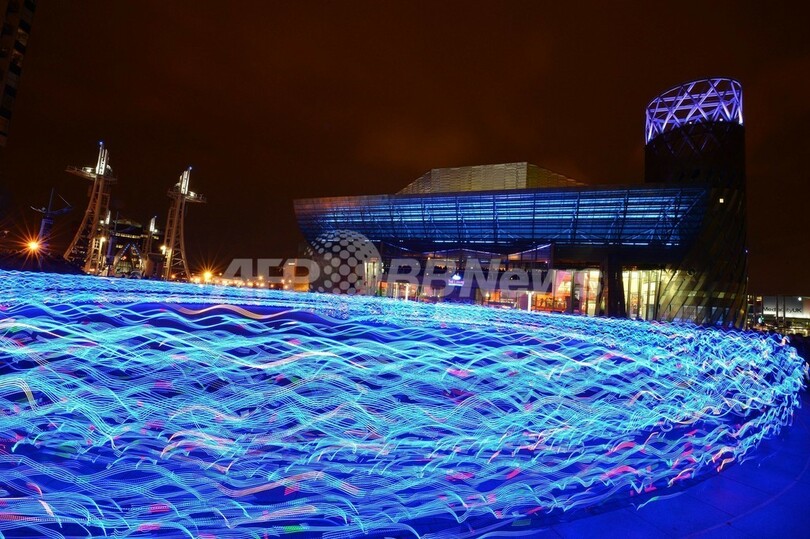 【3月22日 AFP】英東部マンチェスター(Manchester)のサルフォード埠頭(ふとう)にあるローリー劇場(The Lowry)前に21日夜、カラフルな光の帯が出現した。これは、スコットランドのアートチャリティー団体「NVA」が主催したイベント「スピード・オブ・ライト(Speed of Light)」。LED(発光ダイオード)の付いた特殊なウェアを着用した100人程のランナーが走って、さまざまな美しい波のパターンを作り出した。(c)AFP