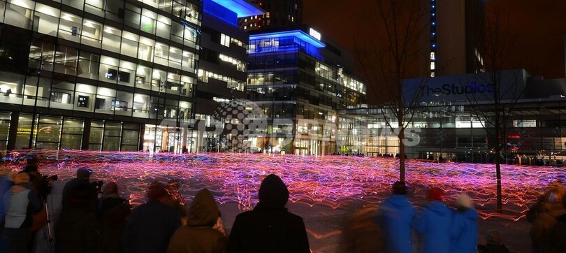 【3月22日 AFP】英東部マンチェスター(Manchester)のサルフォード埠頭(ふとう)にあるローリー劇場(The Lowry)前に21日夜、カラフルな光の帯が出現した。これは、スコットランドのアートチャリティー団体「NVA」が主催したイベント「スピード・オブ・ライト(Speed of Light)」。LED(発光ダイオード)の付いた特殊なウェアを着用した100人程のランナーが走って、さまざまな美しい波のパターンを作り出した。(c)AFP