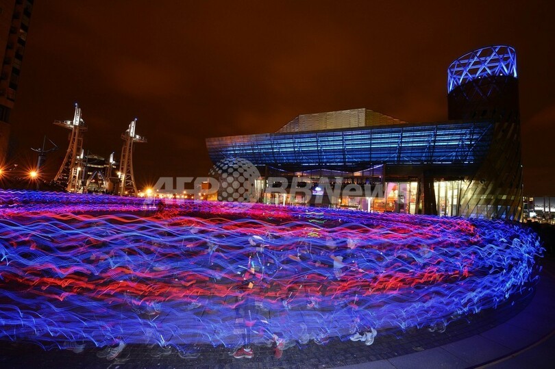 【3月22日 AFP】英東部マンチェスター(Manchester)のサルフォード埠頭(ふとう)にあるローリー劇場(The Lowry)前に21日夜、カラフルな光の帯が出現した。これは、スコットランドのアートチャリティー団体「NVA」が主催したイベント「スピード・オブ・ライト(Speed of Light)」。LED(発光ダイオード)の付いた特殊なウェアを着用した100人程のランナーが走って、さまざまな美しい波のパターンを作り出した。(c)AFP