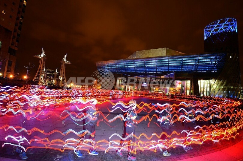 【3月22日 AFP】英東部マンチェスター(Manchester)のサルフォード埠頭(ふとう)にあるローリー劇場(The Lowry)前に21日夜、カラフルな光の帯が出現した。これは、スコットランドのアートチャリティー団体「NVA」が主催したイベント「スピード・オブ・ライト(Speed of Light)」。LED(発光ダイオード)の付いた特殊なウェアを着用した100人程のランナーが走って、さまざまな美しい波のパターンを作り出した。(c)AFP