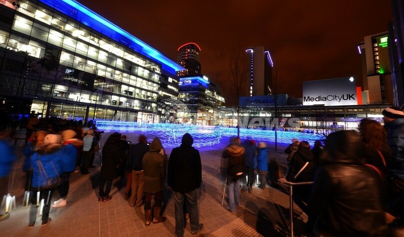 【3月22日 AFP】英東部マンチェスター(Manchester)のサルフォード埠頭(ふとう)にあるローリー劇場(The Lowry)前に21日夜、カラフルな光の帯が出現した。これは、スコットランドのアートチャリティー団体「NVA」が主催したイベント「スピード・オブ・ライト(Speed of Light)」。LED(発光ダイオード)の付いた特殊なウェアを着用した100人程のランナーが走って、さまざまな美しい波のパターンを作り出した。(c)AFP