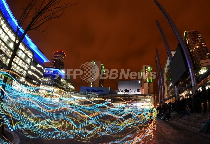 【3月22日 AFP】英東部マンチェスター(Manchester)のサルフォード埠頭(ふとう)にあるローリー劇場(The Lowry)前に21日夜、カラフルな光の帯が出現した。これは、スコットランドのアートチャリティー団体「NVA」が主催したイベント「スピード・オブ・ライト(Speed of Light)」。LED(発光ダイオード)の付いた特殊なウェアを着用した100人程のランナーが走って、さまざまな美しい波のパターンを作り出した。(c)AFP