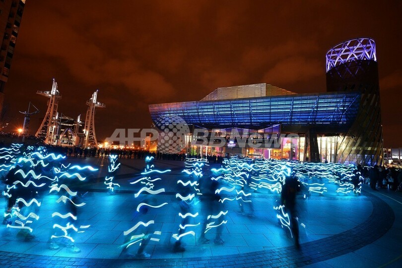 【3月22日 AFP】英東部マンチェスター(Manchester)のサルフォード埠頭(ふとう)にあるローリー劇場(The Lowry)前に21日夜、カラフルな光の帯が出現した。これは、スコットランドのアートチャリティー団体「NVA」が主催したイベント「スピード・オブ・ライト(Speed of Light)」。LED(発光ダイオード)の付いた特殊なウェアを着用した100人程のランナーが走って、さまざまな美しい波のパターンを作り出した。(c)AFP
