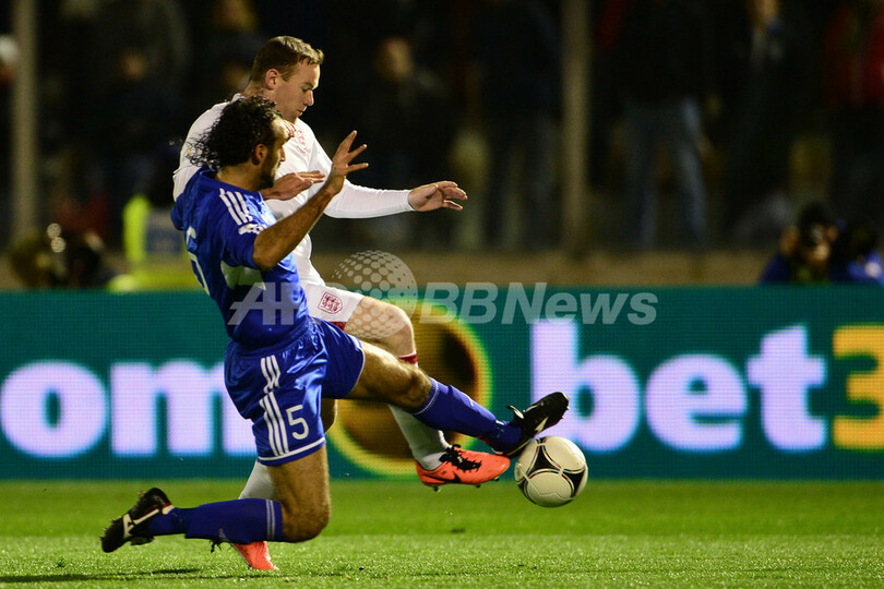 ボールを競るサンマリノのアレッサンドロ・デッラ・ヴァッレ(Alessandro Della Valle、手前)とイングランドのウェイン・ルーニー(Wayne Rooney、2013年3月22日撮影)。(c)AFP/GIUSEPPE CACACE