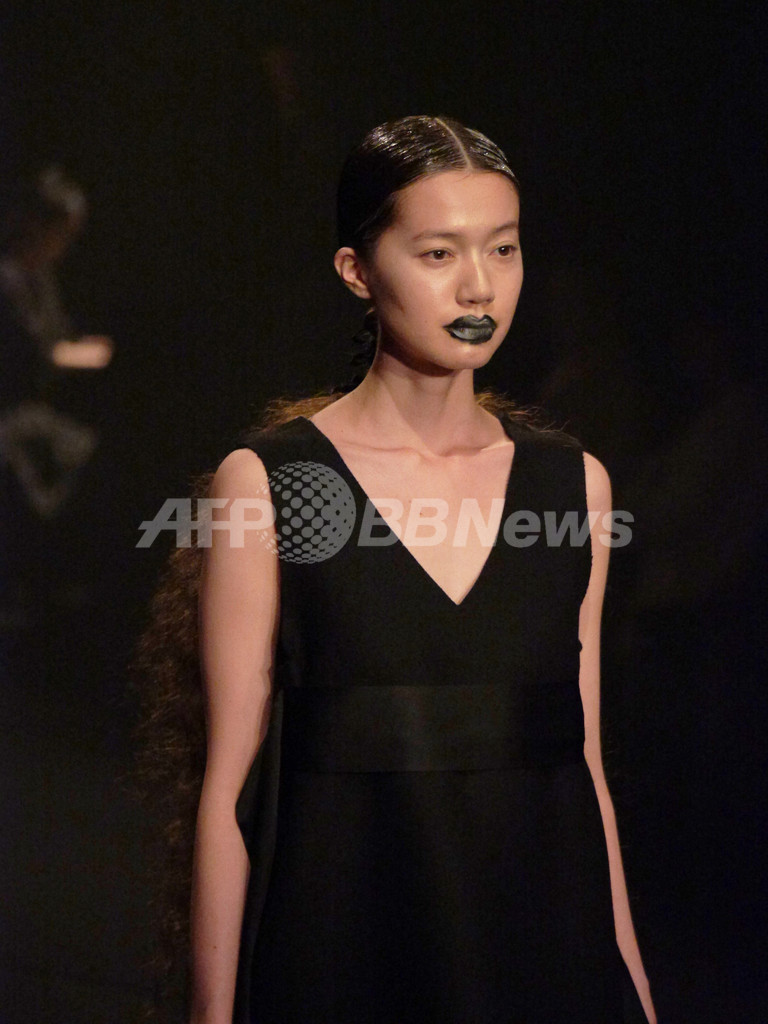 先シーズンまでの柔らかくてかわいらしいテイストからガラリと方向性を変えて、暗闇のなかで真っ黒なコレクションを発表した。ドの音だけでエレガントかつ音の広がりを表現したピアノ演奏のなか、真っ黒な服を着たモデルたちが登場。今回のコレクションについてチダは、「自分にとってこのブランドの物作りはいつも夜、そして暗闇がテーマ。ここ数シーズン続いてきた“カワイイ”ポイントは今回も取り入れたつもり。ただし、“カワイイ”の在り方に変化がでているとは思う。先シーズンで10回目のショーを迎えてみて、あらためてカワイイ部分がブランドの大半を占めているなと。でもそもそもの自分はかなりハードな人間。ブランドを始めた頃の、原点といえるハードな部分に立ち戻りたかった。見えやすい世の中でもないので、見えずらい世の中で暗闇のなかを人とくっついていたいというか・・・いろんなひとたちと言葉や画をクリエーションしていきたい。来シーズン(春夏)で商品構成も大幅に変えたいと考えているので、その前段階の起爆剤になればという想いもある。」【岩田奈那】(c)AFPBB News