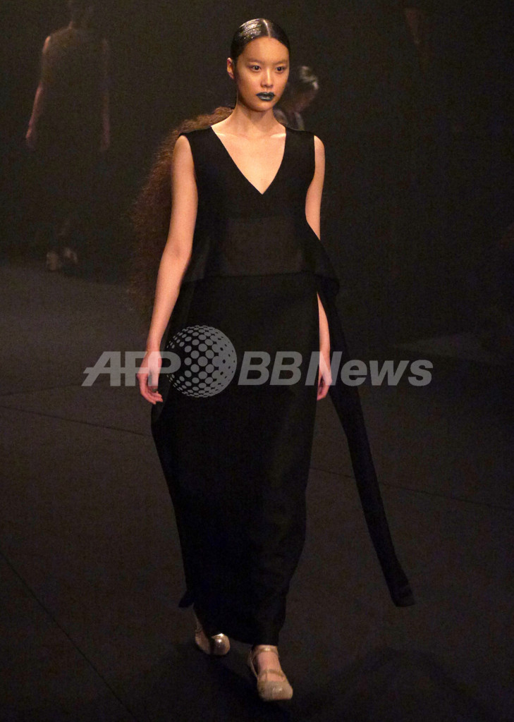 先シーズンまでの柔らかくてかわいらしいテイストからガラリと方向性を変えて、暗闇のなかで真っ黒なコレクションを発表した。ドの音だけでエレガントかつ音の広がりを表現したピアノ演奏のなか、真っ黒な服を着たモデルたちが登場。今回のコレクションについてチダは、「自分にとってこのブランドの物作りはいつも夜、そして暗闇がテーマ。ここ数シーズン続いてきた“カワイイ”ポイントは今回も取り入れたつもり。ただし、“カワイイ”の在り方に変化がでているとは思う。先シーズンで10回目のショーを迎えてみて、あらためてカワイイ部分がブランドの大半を占めているなと。でもそもそもの自分はかなりハードな人間。ブランドを始めた頃の、原点といえるハードな部分に立ち戻りたかった。見えやすい世の中でもないので、見えずらい世の中で暗闇のなかを人とくっついていたいというか・・・いろんなひとたちと言葉や画をクリエーションしていきたい。来シーズン(春夏)で商品構成も大幅に変えたいと考えているので、その前段階の起爆剤になればという想いもある。」【岩田奈那】(c)AFPBB News