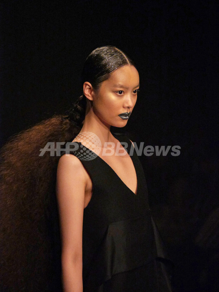 先シーズンまでの柔らかくてかわいらしいテイストからガラリと方向性を変えて、暗闇のなかで真っ黒なコレクションを発表した。ドの音だけでエレガントかつ音の広がりを表現したピアノ演奏のなか、真っ黒な服を着たモデルたちが登場。今回のコレクションについてチダは、「自分にとってこのブランドの物作りはいつも夜、そして暗闇がテーマ。ここ数シーズン続いてきた“カワイイ”ポイントは今回も取り入れたつもり。ただし、“カワイイ”の在り方に変化がでているとは思う。先シーズンで10回目のショーを迎えてみて、あらためてカワイイ部分がブランドの大半を占めているなと。でもそもそもの自分はかなりハードな人間。ブランドを始めた頃の、原点といえるハードな部分に立ち戻りたかった。見えやすい世の中でもないので、見えずらい世の中で暗闇のなかを人とくっついていたいというか・・・いろんなひとたちと言葉や画をクリエーションしていきたい。来シーズン(春夏)で商品構成も大幅に変えたいと考えているので、その前段階の起爆剤になればという想いもある。」【岩田奈那】(c)AFPBB News