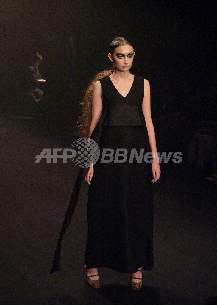 先シーズンまでの柔らかくてかわいらしいテイストからガラリと方向性を変えて、暗闇のなかで真っ黒なコレクションを発表した。ドの音だけでエレガントかつ音の広がりを表現したピアノ演奏のなか、真っ黒な服を着たモデルたちが登場。今回のコレクションについてチダは、「自分にとってこのブランドの物作りはいつも夜、そして暗闇がテーマ。ここ数シーズン続いてきた“カワイイ”ポイントは今回も取り入れたつもり。ただし、“カワイイ”の在り方に変化がでているとは思う。先シーズンで10回目のショーを迎えてみて、あらためてカワイイ部分がブランドの大半を占めているなと。でもそもそもの自分はかなりハードな人間。ブランドを始めた頃の、原点といえるハードな部分に立ち戻りたかった。見えやすい世の中でもないので、見えずらい世の中で暗闇のなかを人とくっついていたいというか・・・いろんなひとたちと言葉や画をクリエーションしていきたい。来シーズン(春夏)で商品構成も大幅に変えたいと考えているので、その前段階の起爆剤になればという想いもある。」【岩田奈那】(c)AFPBB News