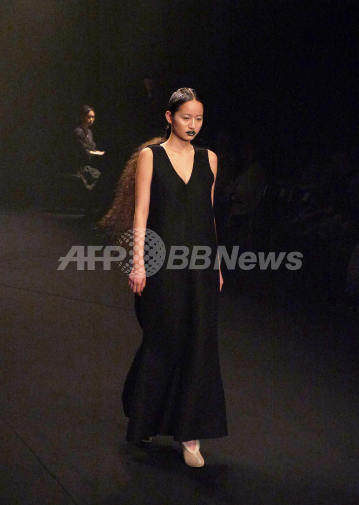 先シーズンまでの柔らかくてかわいらしいテイストからガラリと方向性を変えて、暗闇のなかで真っ黒なコレクションを発表した。ドの音だけでエレガントかつ音の広がりを表現したピアノ演奏のなか、真っ黒な服を着たモデルたちが登場。今回のコレクションについてチダは、「自分にとってこのブランドの物作りはいつも夜、そして暗闇がテーマ。ここ数シーズン続いてきた“カワイイ”ポイントは今回も取り入れたつもり。ただし、“カワイイ”の在り方に変化がでているとは思う。先シーズンで10回目のショーを迎えてみて、あらためてカワイイ部分がブランドの大半を占めているなと。でもそもそもの自分はかなりハードな人間。ブランドを始めた頃の、原点といえるハードな部分に立ち戻りたかった。見えやすい世の中でもないので、見えずらい世の中で暗闇のなかを人とくっついていたいというか・・・いろんなひとたちと言葉や画をクリエーションしていきたい。来シーズン(春夏)で商品構成も大幅に変えたいと考えているので、その前段階の起爆剤になればという想いもある。」【岩田奈那】(c)AFPBB News