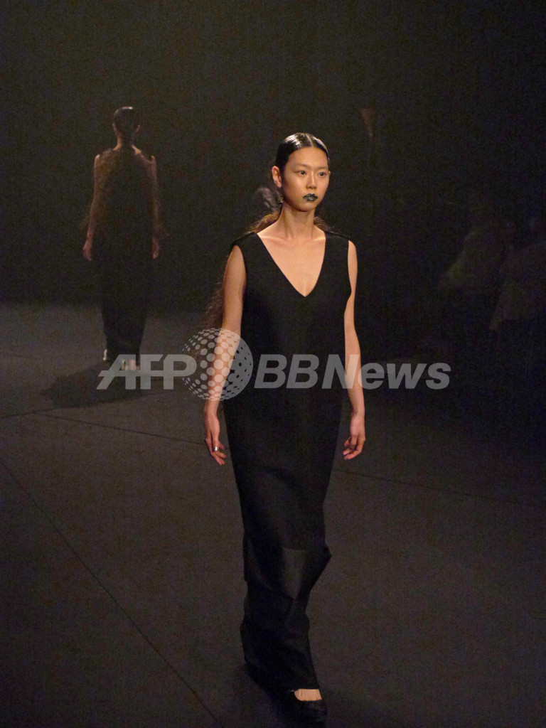 先シーズンまでの柔らかくてかわいらしいテイストからガラリと方向性を変えて、暗闇のなかで真っ黒なコレクションを発表した。ドの音だけでエレガントかつ音の広がりを表現したピアノ演奏のなか、真っ黒な服を着たモデルたちが登場。今回のコレクションについてチダは、「自分にとってこのブランドの物作りはいつも夜、そして暗闇がテーマ。ここ数シーズン続いてきた“カワイイ”ポイントは今回も取り入れたつもり。ただし、“カワイイ”の在り方に変化がでているとは思う。先シーズンで10回目のショーを迎えてみて、あらためてカワイイ部分がブランドの大半を占めているなと。でもそもそもの自分はかなりハードな人間。ブランドを始めた頃の、原点といえるハードな部分に立ち戻りたかった。見えやすい世の中でもないので、見えずらい世の中で暗闇のなかを人とくっついていたいというか・・・いろんなひとたちと言葉や画をクリエーションしていきたい。来シーズン(春夏)で商品構成も大幅に変えたいと考えているので、その前段階の起爆剤になればという想いもある。」【岩田奈那】(c)AFPBB News