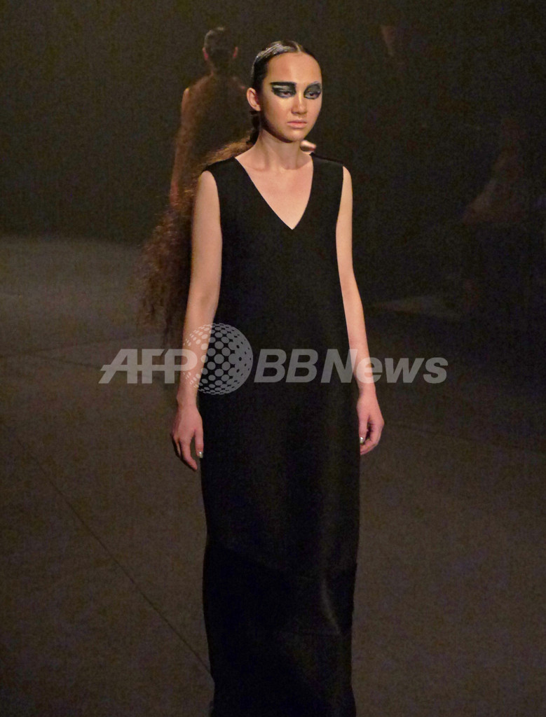 先シーズンまでの柔らかくてかわいらしいテイストからガラリと方向性を変えて、暗闇のなかで真っ黒なコレクションを発表した。ドの音だけでエレガントかつ音の広がりを表現したピアノ演奏のなか、真っ黒な服を着たモデルたちが登場。今回のコレクションについてチダは、「自分にとってこのブランドの物作りはいつも夜、そして暗闇がテーマ。ここ数シーズン続いてきた“カワイイ”ポイントは今回も取り入れたつもり。ただし、“カワイイ”の在り方に変化がでているとは思う。先シーズンで10回目のショーを迎えてみて、あらためてカワイイ部分がブランドの大半を占めているなと。でもそもそもの自分はかなりハードな人間。ブランドを始めた頃の、原点といえるハードな部分に立ち戻りたかった。見えやすい世の中でもないので、見えずらい世の中で暗闇のなかを人とくっついていたいというか・・・いろんなひとたちと言葉や画をクリエーションしていきたい。来シーズン(春夏)で商品構成も大幅に変えたいと考えているので、その前段階の起爆剤になればという想いもある。」【岩田奈那】(c)AFPBB News