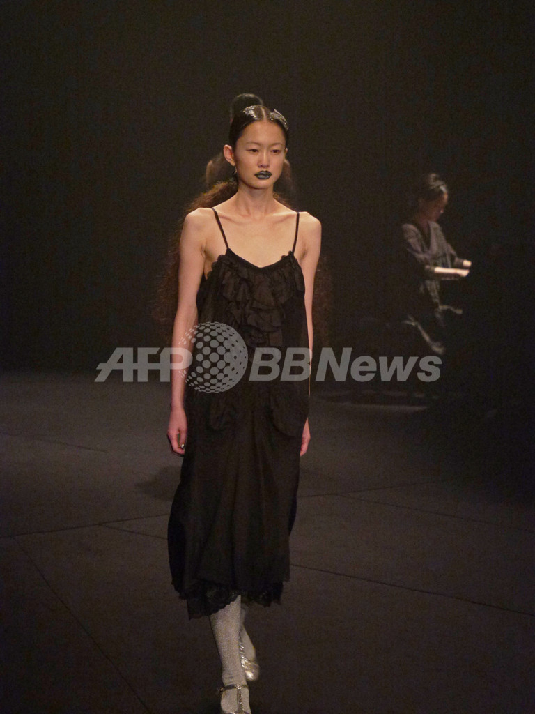 先シーズンまでの柔らかくてかわいらしいテイストからガラリと方向性を変えて、暗闇のなかで真っ黒なコレクションを発表した。ドの音だけでエレガントかつ音の広がりを表現したピアノ演奏のなか、真っ黒な服を着たモデルたちが登場。今回のコレクションについてチダは、「自分にとってこのブランドの物作りはいつも夜、そして暗闇がテーマ。ここ数シーズン続いてきた“カワイイ”ポイントは今回も取り入れたつもり。ただし、“カワイイ”の在り方に変化がでているとは思う。先シーズンで10回目のショーを迎えてみて、あらためてカワイイ部分がブランドの大半を占めているなと。でもそもそもの自分はかなりハードな人間。ブランドを始めた頃の、原点といえるハードな部分に立ち戻りたかった。見えやすい世の中でもないので、見えずらい世の中で暗闇のなかを人とくっついていたいというか・・・いろんなひとたちと言葉や画をクリエーションしていきたい。来シーズン(春夏)で商品構成も大幅に変えたいと考えているので、その前段階の起爆剤になればという想いもある。」【岩田奈那】(c)AFPBB News