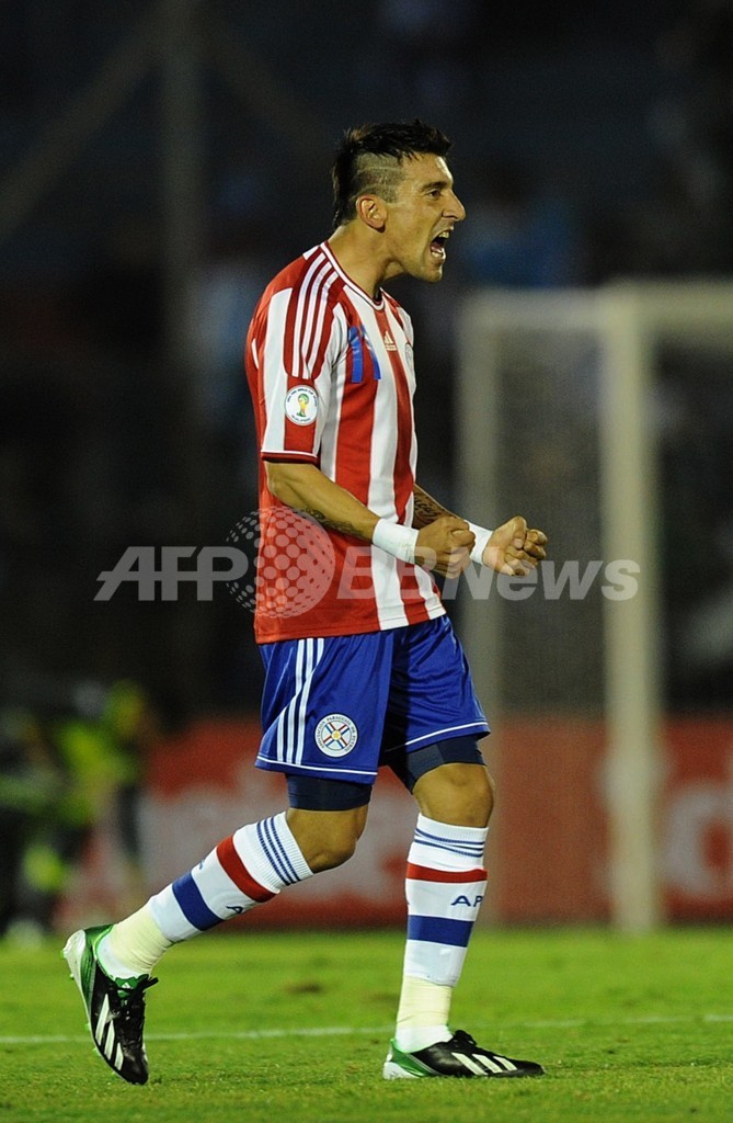 後半41分に同点ゴールを決めて歓喜するパラグアイのエドガル・ベニテス(Edgar Benitez、2013年3月22日撮影)。(c)AFP/MIGUEL ROJO