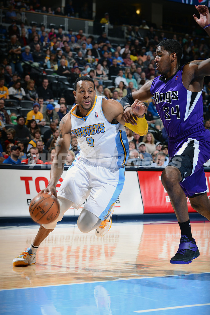 サクラメント・キングスのジェイソン・トンプソン(Jason Thompson、右)にドライブを仕掛けるデンバー・ナゲッツのアンドレ・イグダーラ(Andre Iguodala、2013年3月23日撮影)。(c)AFP/Getty Images/NBAE/Garrett W. Ellwood