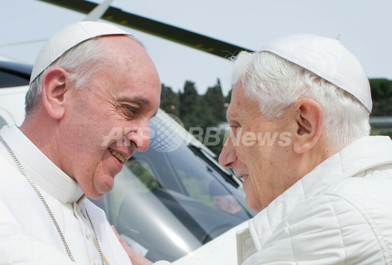 【3月24日 AFP】(写真追加)ローマ・カトリック教会のフランシスコ(Francis)法王(76)は23日、先月末に退任して「名誉法王」となったベネディクト16世(Benedict XVI、85)と会談した。ローマ法王が生前に退位したのは約600年ぶりで、カトリック教会の約2000年の歴史の中でも2度目にすぎないため、新旧の法王が会談するのは極めて異例。(c)AFP/Dario THUBURN, Vincenzo PINTO