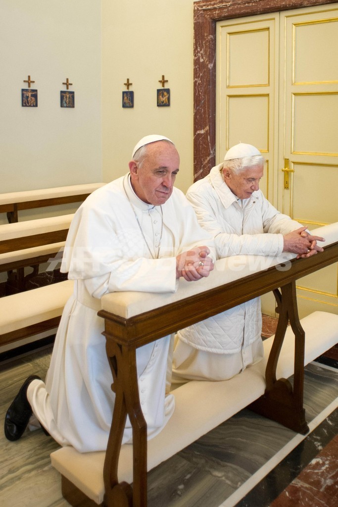 写真は、カステルガンドルフォの離宮で祈りをささげるローマ・カトリック教会のフランシスコ法王(左)と名誉法王ベネディクト16世(2013年3月23日撮影)。(c)AFP/OSSERVATORE ROMANO