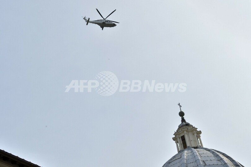 写真は、ローマ・カトリック教会のフランシスコ法王を乗せてカステルガンドルフォの離宮に到着するヘリコプター(2013年3月23日撮影)。(c)AFP/ANDREAS SOLARO