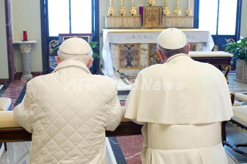 写真は、カステルガンドルフォの離宮で祈りをささげるローマ・カトリック教会のフランシスコ法王(左)と名誉法王ベネディクト16世(2013年3月23日撮影)。(c)AFP/OSSERVATORE ROMANO