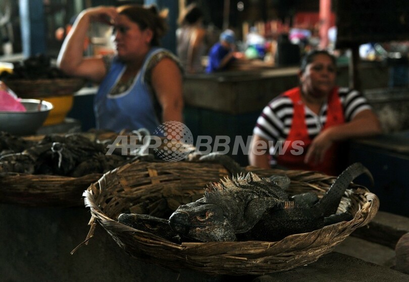 スペイン語でガロボ(garrobo)と呼ばれているイグアナを市場で2匹調達したマヌエル・サモラ(Manuel Zamora)さんは「(イグアナは)本当においしい。これは伝統料理だ」と熱っぽく語った。イグアナの肉と卵を、ひいて焼いたコーンミールや野菜と一緒に煮込んだスープは広く好まれている。