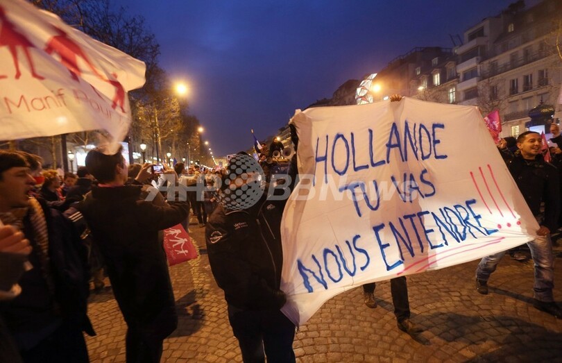 【3月25日 AFP】フランス・パリ(Paris)のシャンゼリゼ(Champs Elysees)通りで24日、同性婚合法化法案に反対する数十万人規模の大規模な抗議デモが行われた。