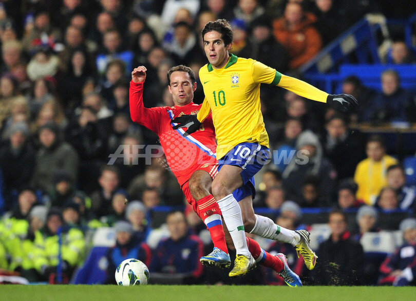 ボールを競るロシアのロマン・シロコフ(Roman Shirokov、左)とボールを競るブラジルのカカ(Kaka、2013年3月25日撮影)。(c)AFP/GLYN KIRK