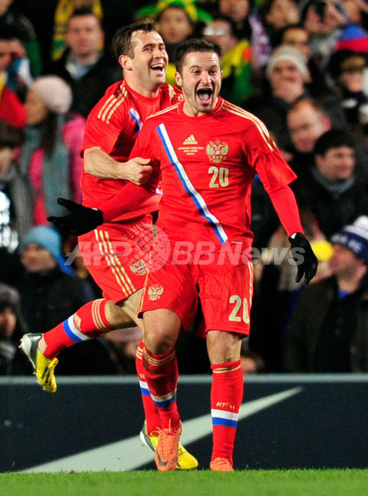 後半28分に先制ゴールを挙げて喜ぶロシアのビクトル・ファイズリン(Victor Fayzulin、右、2013年3月25日撮影)。(c)AFP/GLYN KIRK