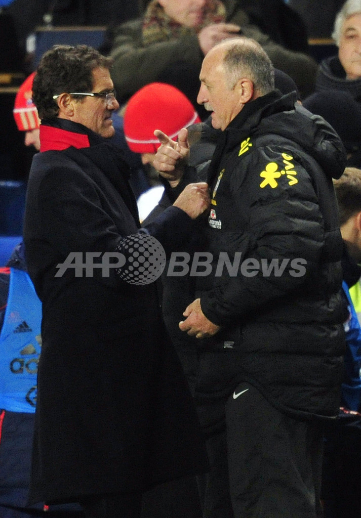 試合後に言葉を交わすロシアのファビオ・カペッロ(Fabio Capello)監督(左)とブラジルのルイス・フェリペ・スコラーリ(Luiz Felipe Scolari)監督(2013年3月25日撮影)。(c)AFP/GLYN KIRK