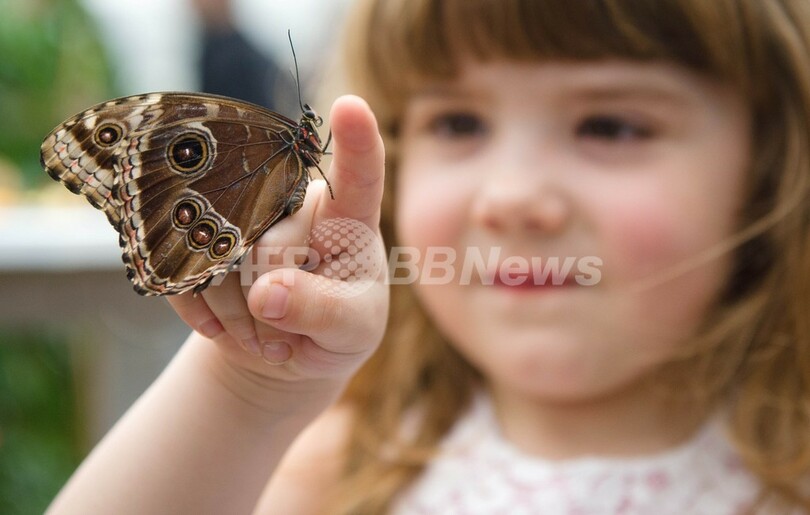 同展では蝶たちが敷地内の施設の中を自由に飛び回る姿や、さなぎからふ化する姿を観察できる。一般公開は今月29日から9月15日まで。(c)AFP