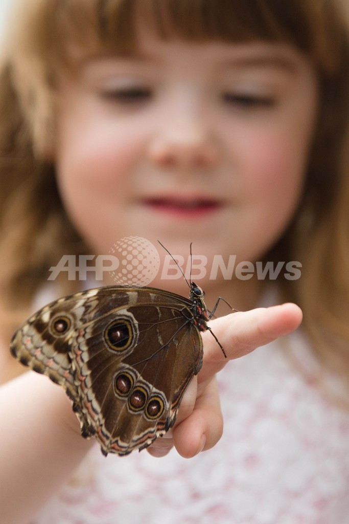 同展では蝶たちが敷地内の施設の中を自由に飛び回る姿や、さなぎからふ化する姿を観察できる。一般公開は今月29日から9月15日まで。(c)AFP