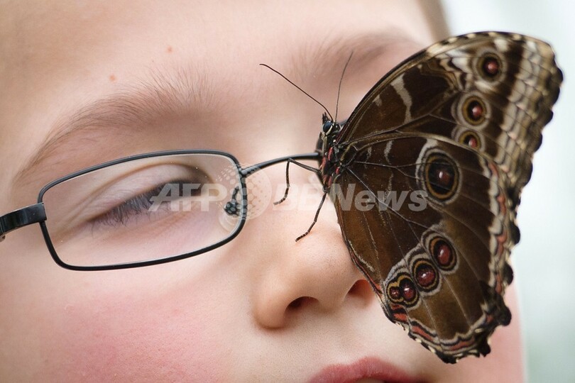 同展では蝶たちが敷地内の施設の中を自由に飛び回る姿や、さなぎからふ化する姿を観察できる。一般公開は今月29日から9月15日まで。(c)AFP