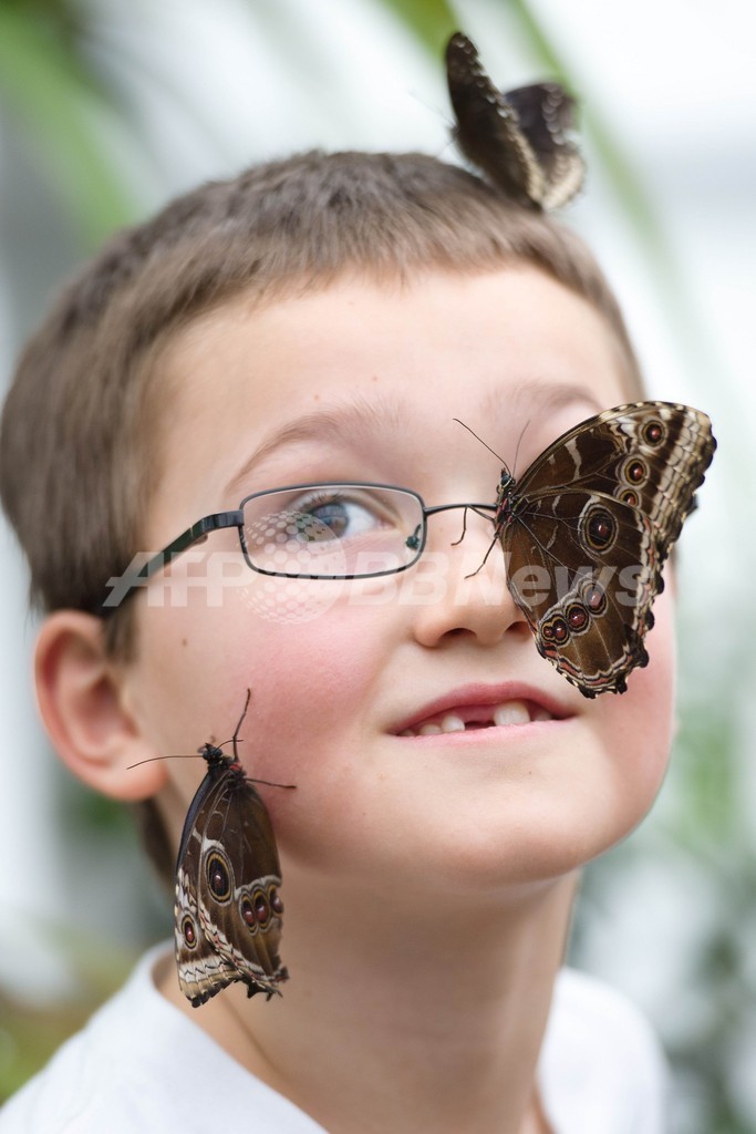 同展では蝶たちが敷地内の施設の中を自由に飛び回る姿や、さなぎからふ化する姿を観察できる。一般公開は今月29日から9月15日まで。(c)AFP