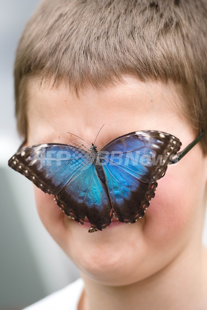 同展では蝶たちが敷地内の施設の中を自由に飛び回る姿や、さなぎからふ化する姿を観察できる。一般公開は今月29日から9月15日まで。(c)AFP