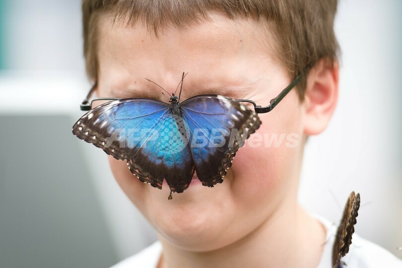 同展では蝶たちが敷地内の施設の中を自由に飛び回る姿や、さなぎからふ化する姿を観察できる。一般公開は今月29日から9月15日まで。(c)AFP