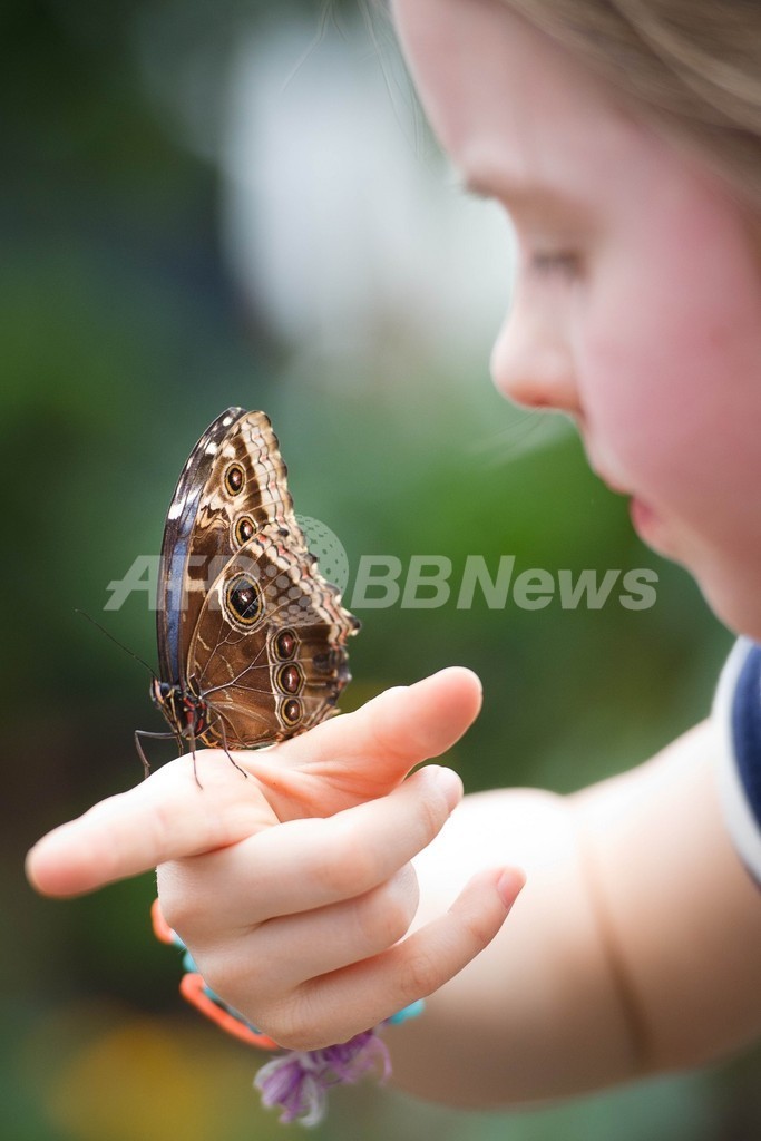 同展では蝶たちが敷地内の施設の中を自由に飛び回る姿や、さなぎからふ化する姿を観察できる。一般公開は今月29日から9月15日まで。(c)AFP