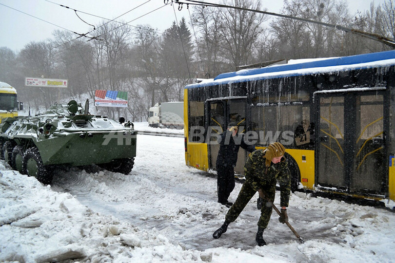 写真はキエフ市内で、大雪で立ち往生したトラム(路面電車)線路上の雪を除くウクライナ軍兵士(2013年3月23日撮影)。(c)AFP/UKRAINIAN DEFENSE MINISTRY