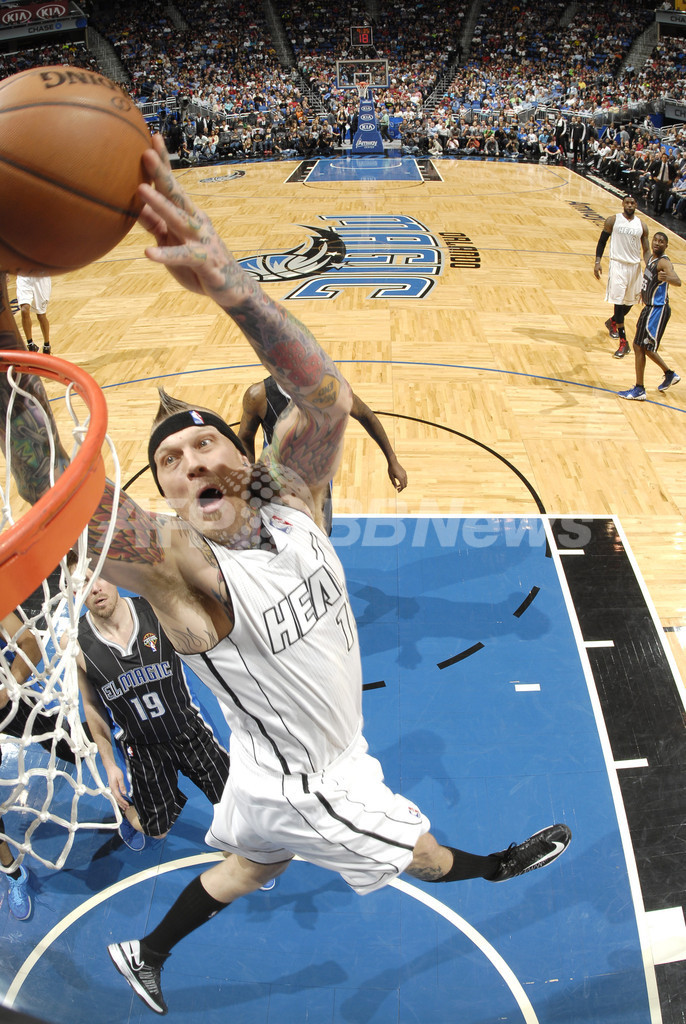 シュートを狙うマイアミ・ヒートのクリス・アンダーセン(Chris Andersen、2013年3月25日撮影)。(c)AFP/Getty Images/NBAE/Fernando Medina
